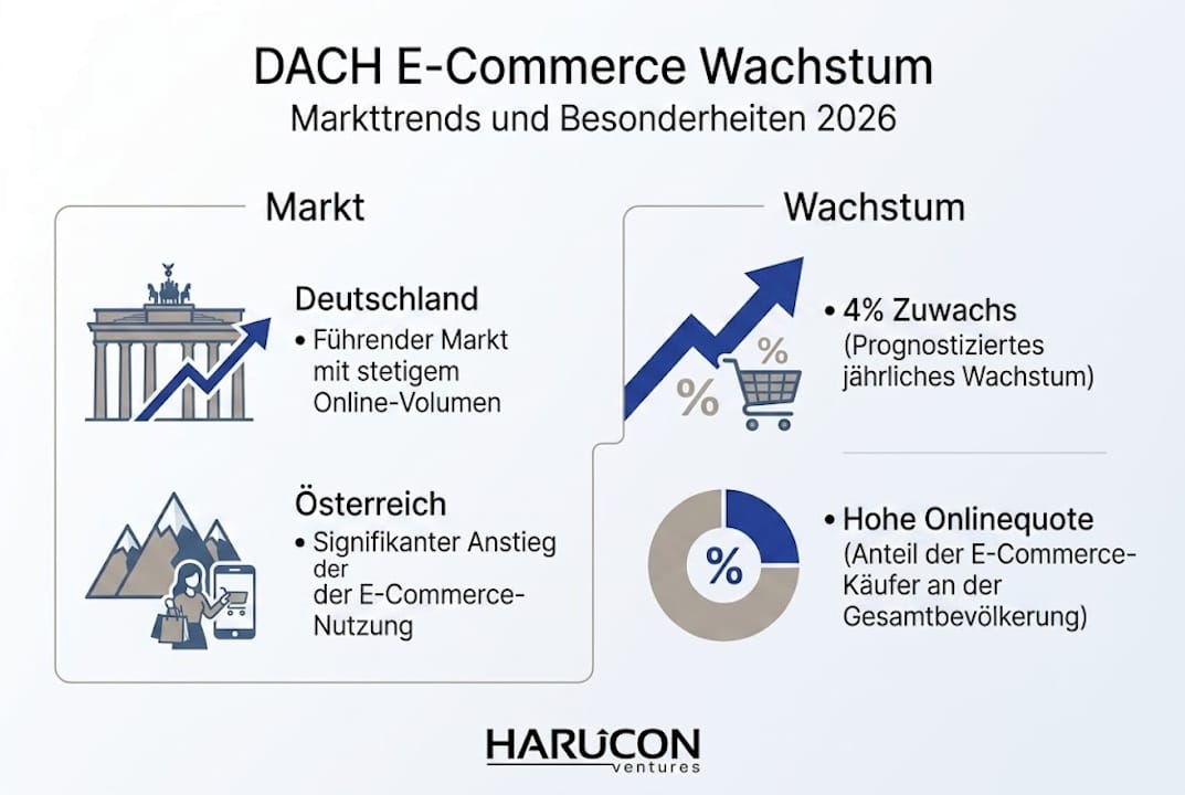 Der DACH-Raum ist kein homogener Markt. Das vergessen viele Gründer, wenn sie ihre Skalierungsstrategie entwerfen. Deutschland wächst mit rund 4%, Österreich hingegen verzeichnete 2025 ein Wachstum von 14% und pendelt sich ab 2026 auf 8 bis 9% ein. Die Online-Penetrationsrate nähert sich in manchen Segmenten der 95%-Marke. Das bedeutet: Der Kuchen wächst, aber er wird auch von mehr Spielern begehrt.