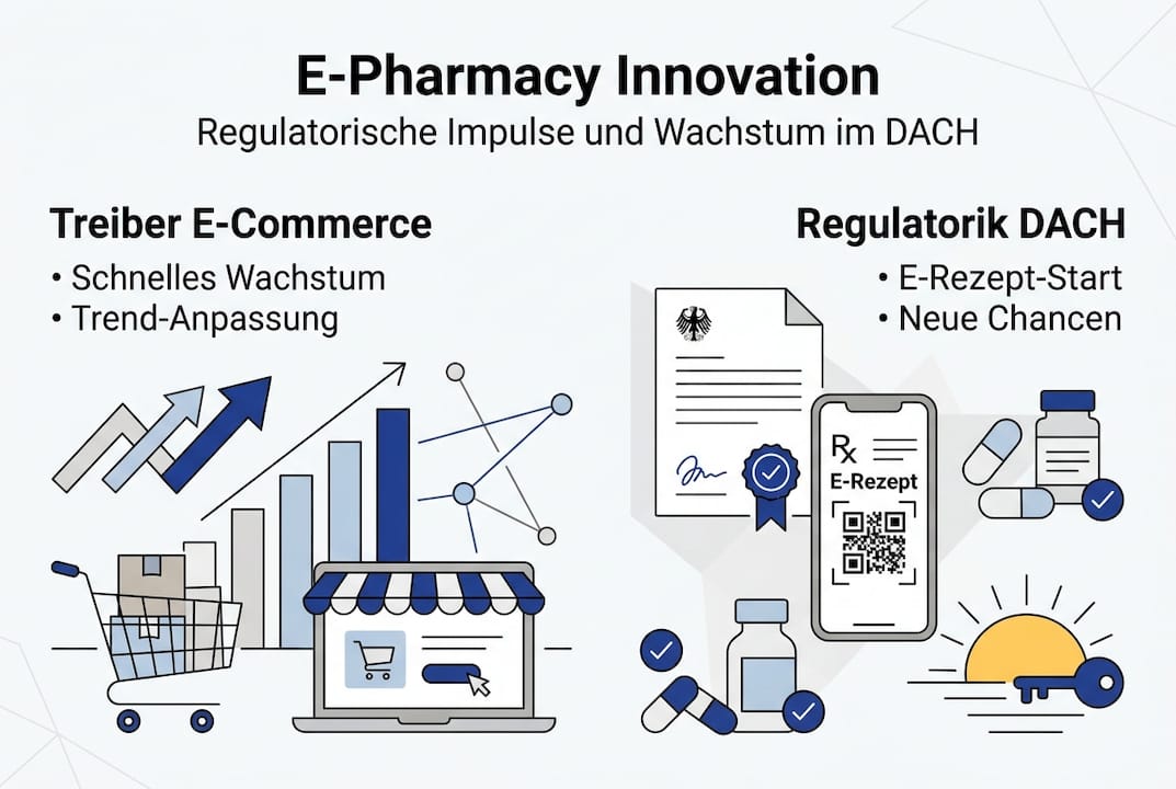 Kein anderes regulatorisches Ereignis hat den DACH-E-Commerce in den letzten Jahren so stark verändert wie das E-Rezept. Die Zahlen sind eindeutig: E-Pharmacy-Wachstum auf 982 Mio. € entspricht einem Anstieg von 82%, und Shop Apotheke hält dabei 54% Marktanteil. Das ist kein organisches Wachstum. Das ist Innovation durch regulatorischen Wandel.